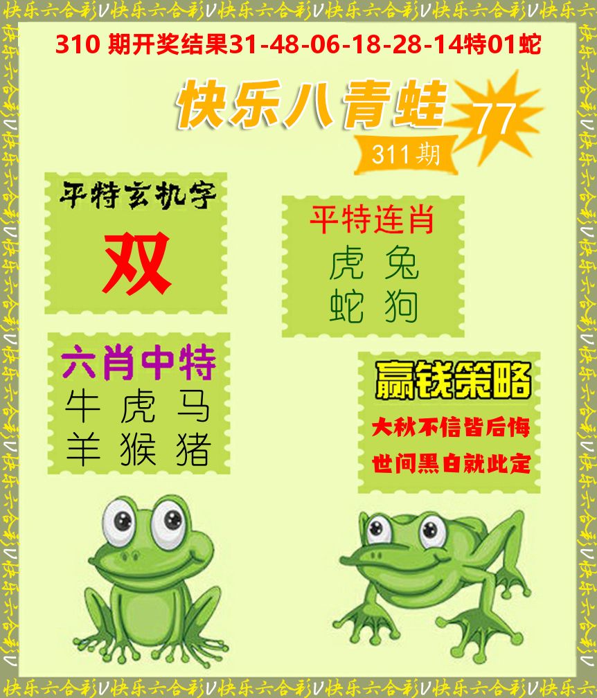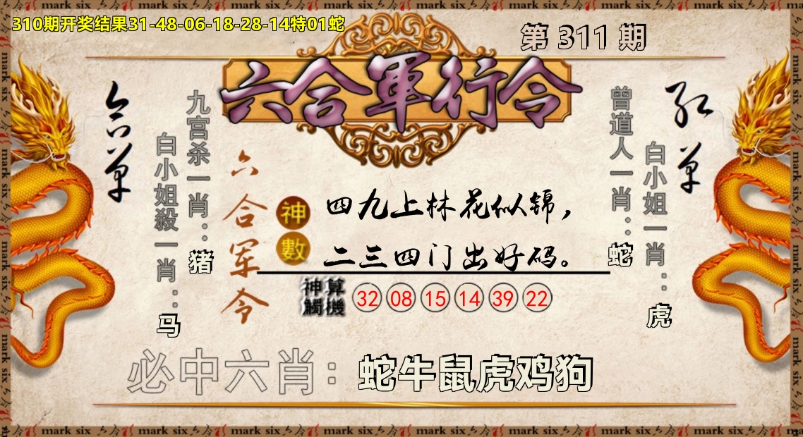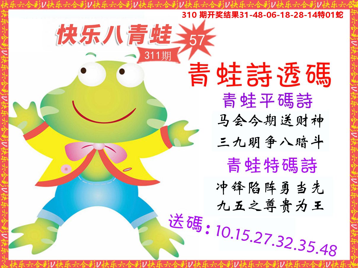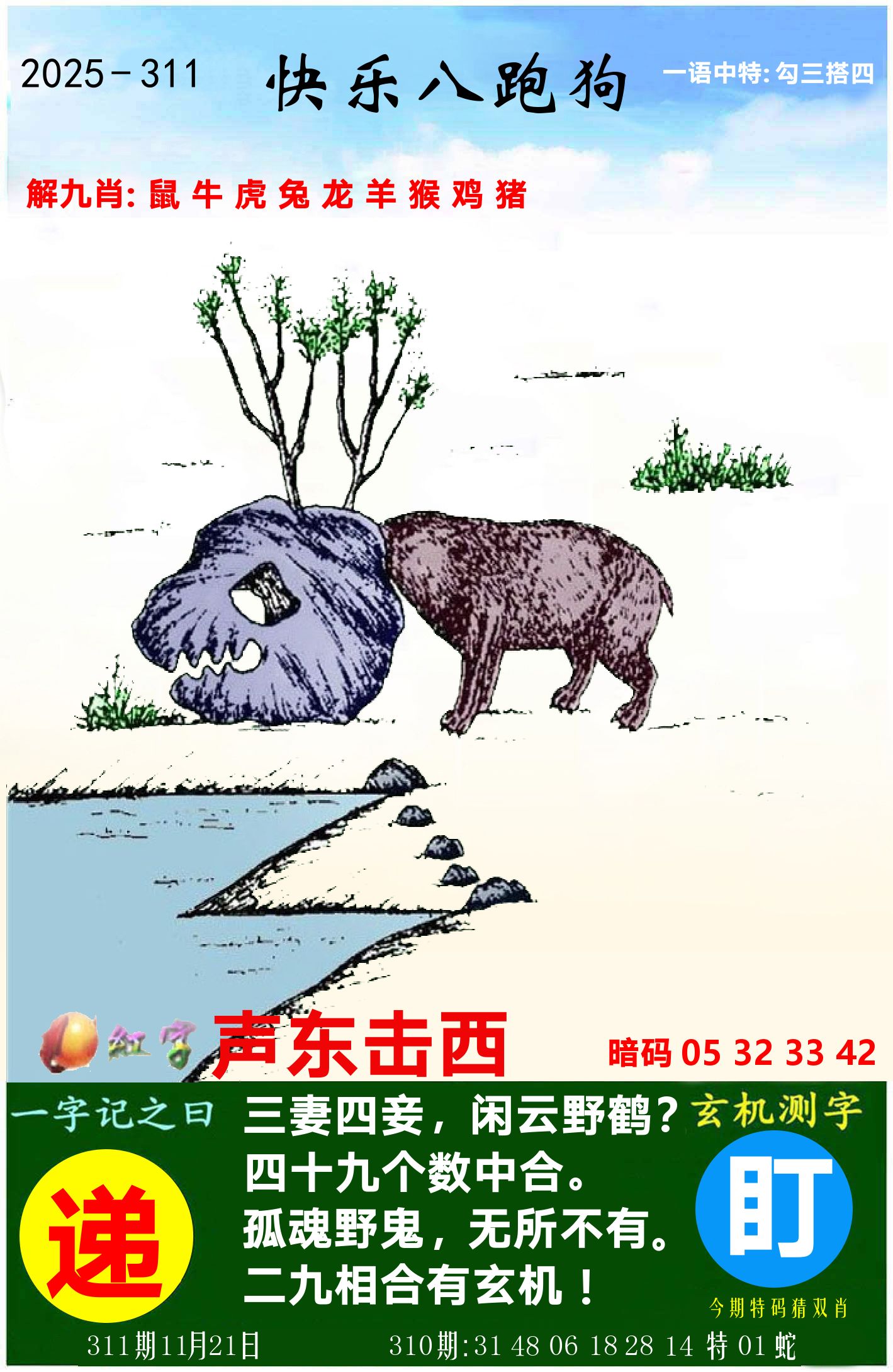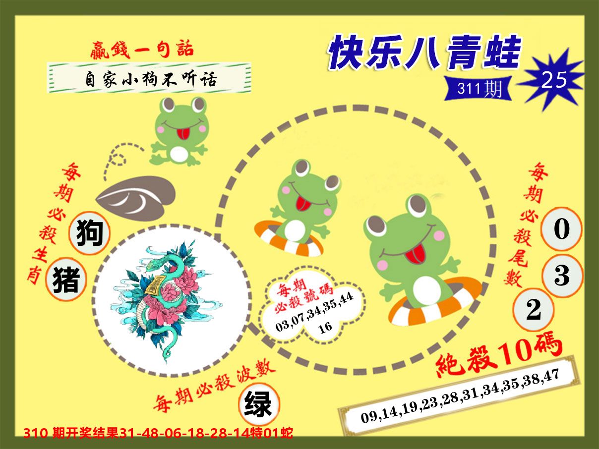 解:猪前狗后结亲家,得猪狗,看看地支是哪家,是地肖蛇羊鸡狗鼠虎,开狗32