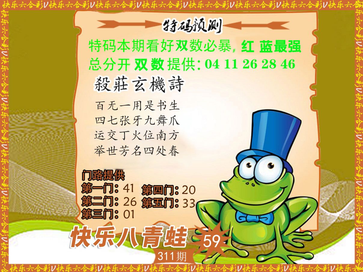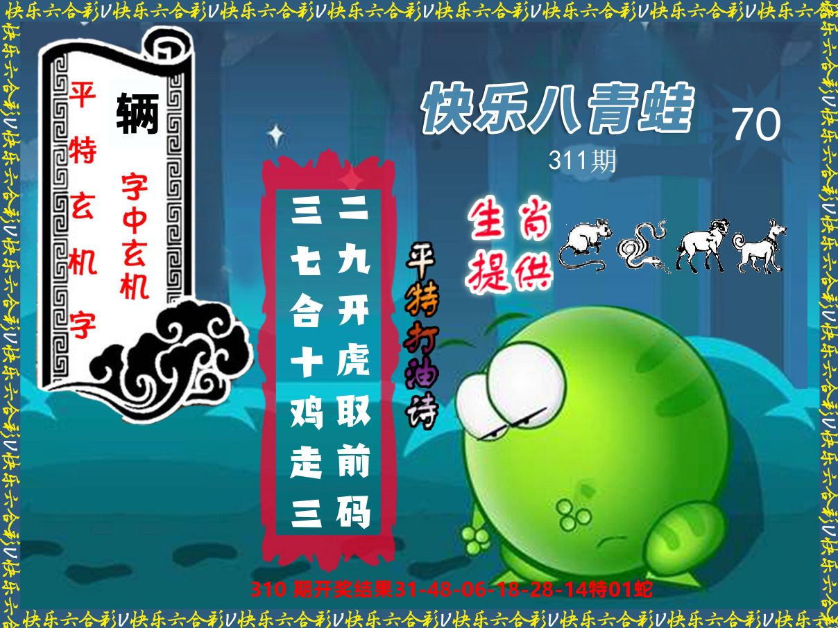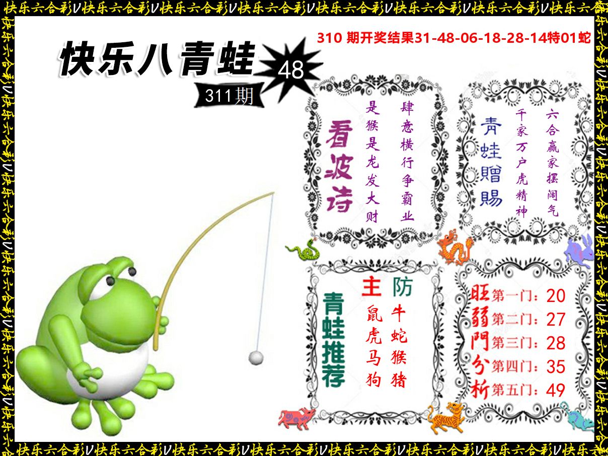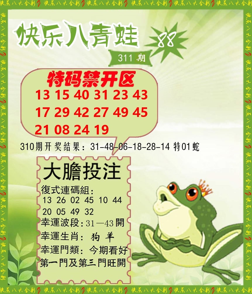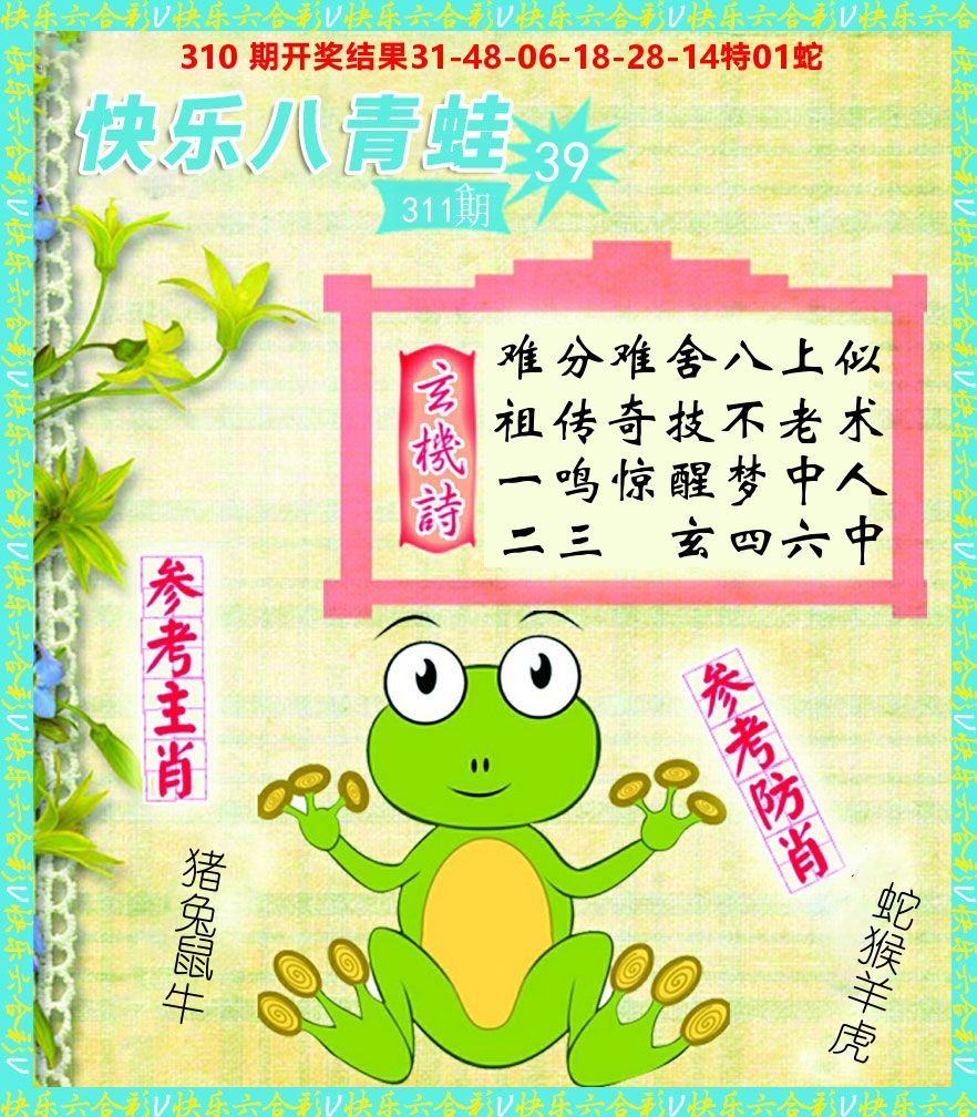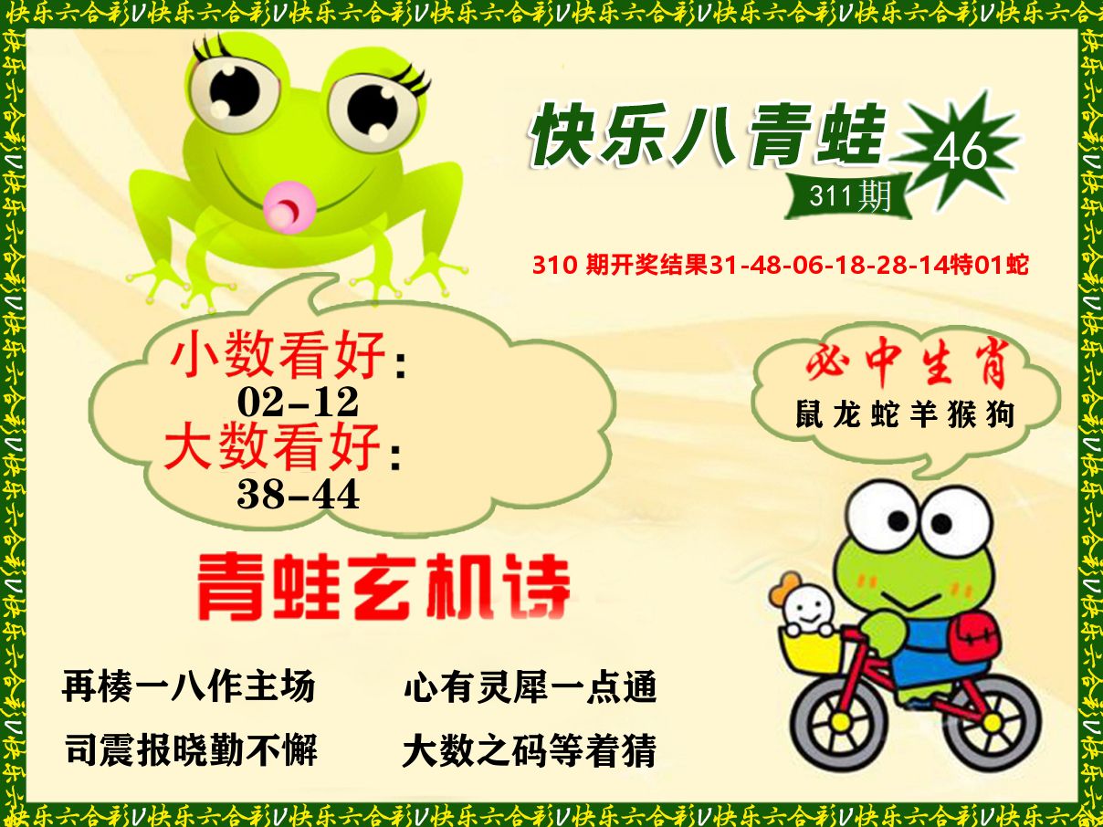解:猪前狗后结亲家,得猪狗,看看地支是哪家,是地肖蛇羊鸡狗鼠虎,开鸡45