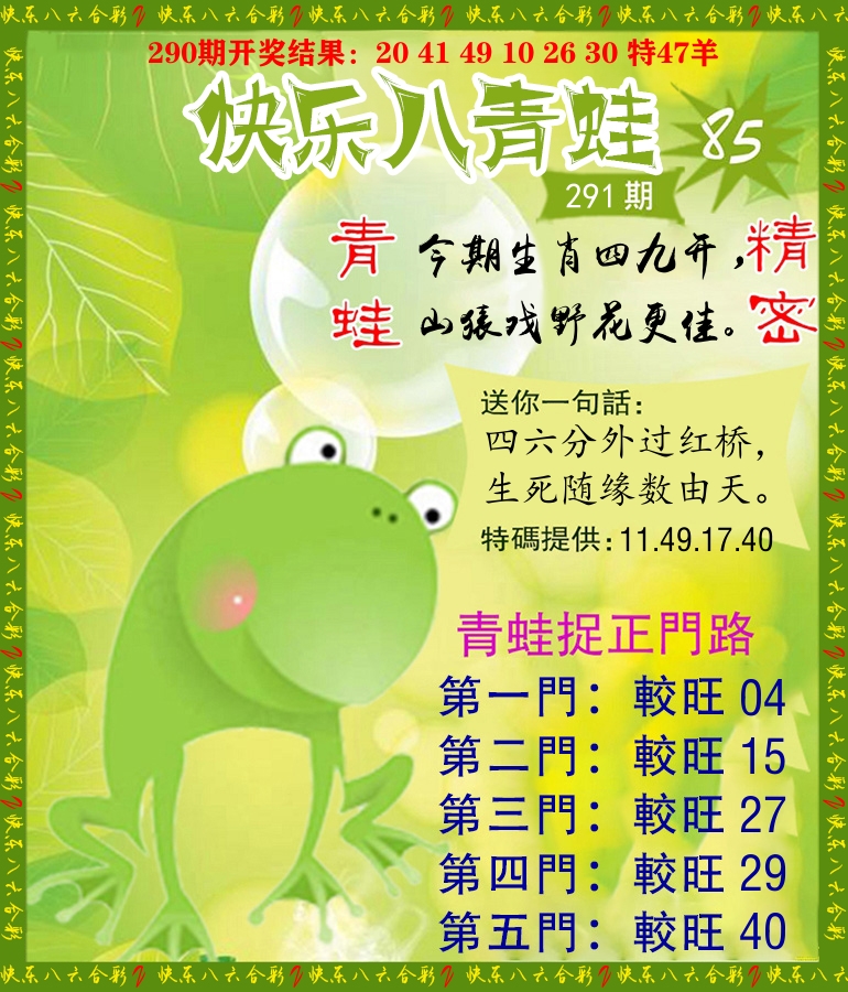 解:猪前狗后结亲家,得猪狗,看看地支是哪家,是地肖蛇羊鸡狗鼠虎,开鸡45